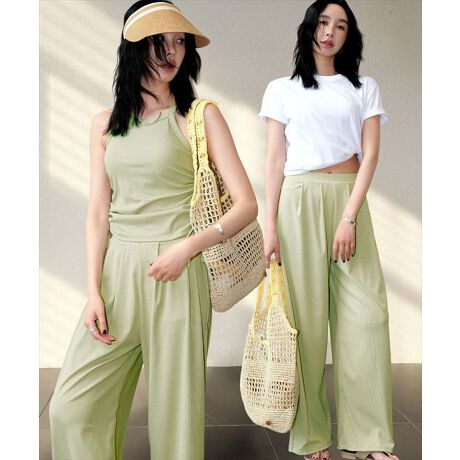 ハイウエストのロングパンツを合わせると腰回りや足を隠し体型カバーが実現。