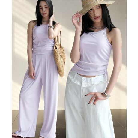トップスは、アメリカンスリーブのキャミソールになっており、サイドのドロストでたるみを表現。