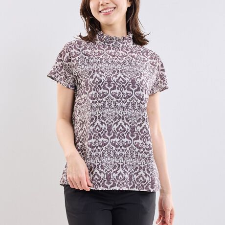 重なりによる透過をプリントで表現したダマスク柄が魅力的なブラウス。実際には透けないポリエステル生地を使用し、1枚でさらりと着こなすことができます。色はモノトーンとオレンジベースの2色展開。フリルをあしらった低めのスタンドカラーと、少し長めのフレンチスリーブが魅力的。シンプルな無地のボトムスと合わせたバランスの良いスタイリングがおすすめです。