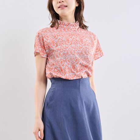 重なりによる透過をプリントで表現したダマスク柄が魅力的なブラウス。実際には透けないポリエステル生地を使用し、1枚でさらりと着こなすことができます。色はモノトーンとオレンジベースの2色展開。フリルをあしらった低めのスタンドカラーと、少し長めのフレンチスリーブが魅力的。シンプルな無地のボトムスと合わせたバランスの良いスタイリングがおすすめです。