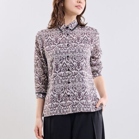 重なりによる透過を表現したダマスクプリントがエレガントな女性らしさを演出するシャツ。実際には透けないポリエステル生地を使用し、インナーを選ぶことなく着用できます。色はモノトーンとオレンジベースの2色展開。季節の変わり目や春先に重宝したい定番の七分袖シャツタイプです。1枚着としてはもちろん、羽織りとしても着用できる、着回し力の高いアイテムです。