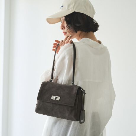 なめらかな牛革スエードに、フロントのひねり金具が控えめなアクセントを添えます。
