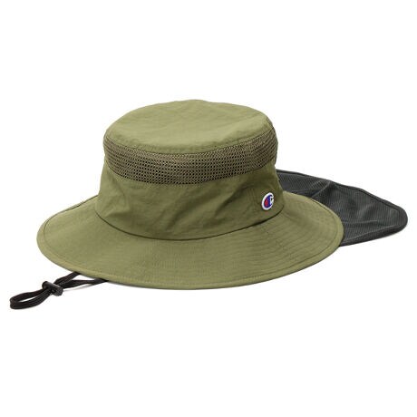 [型番:187-0115]チャンピオン サンシールドアドベンチャーハット チャンピオンならではのスポーツテイストの人気アイテム シンプルで飽きの来ないデザイン 日よけのシェード(たれ)は接触冷感機能付きで、うなじから首筋にかけて直射日光から守ります。UVカット率99.9%以上 UPF50+ 洗濯可能