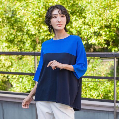 大胆な切替が印象的なサマーニット。