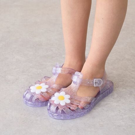 ・クリアラメのジェル素材にデイジーモチーフをあしらったキラキラサンダル