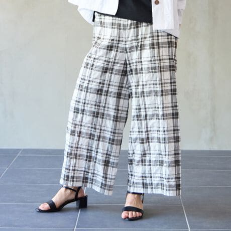 ふんわりとした表面感とソフトで軽やかな風合いが特徴の先染めコットン素材のチェックパンツ。国内でおつくりしている素材。