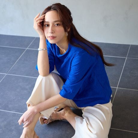 綿100%素材を使用したカットソー素材のTシャツ。カーブ線で描いたジャカードの立体的な表現がさりげなくて上品。伸縮性があり着心地の良い素材。綿100%のため清涼感がありさらりとした質感。エクラの定番人気素材です。