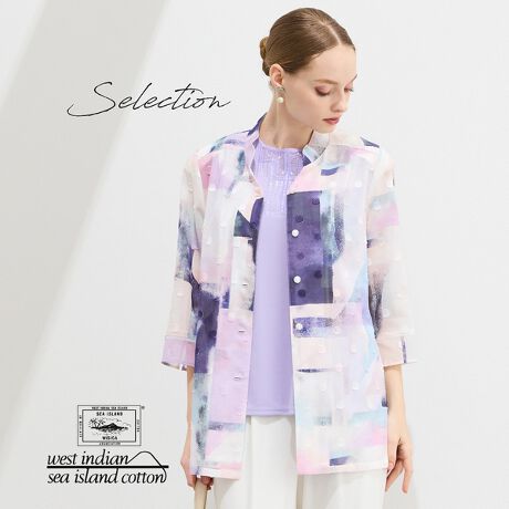 上質感のある素材を贅沢に使用したブラウス。淡くきれいな色が女性らしくアート調のプリントが素敵。キレイめボトムと合わせてエレガントな着こなしに。