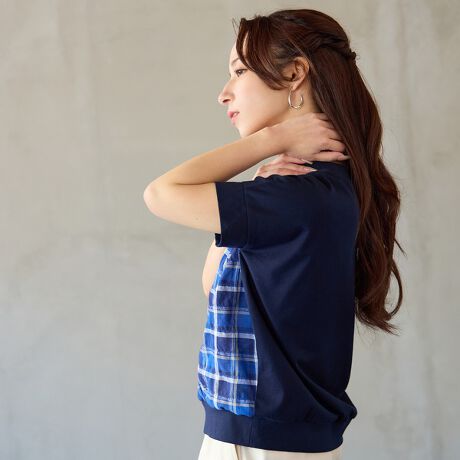 ふんわりとした表面感とソフトで軽やかな風合いが特徴の先染めコットン素材と天竺のカットソー素材をドッキングしたデザインTシャツ。