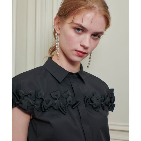 沢山の小さなグログランリボンが胸元に装飾された目を引くブラウス。