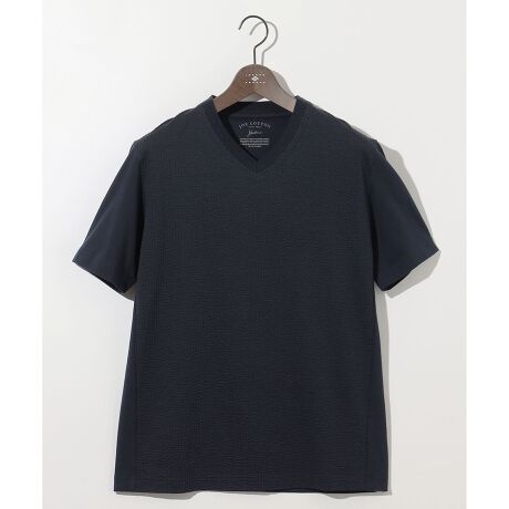 前身頃は表情豊かな凹凸のあるサッカー生地、後身頃と袖は滑らかな平編み生地を組み合わせた洗練されたデザインです。サッカーと天竺のコンビTシャツは衿の同色のニットパーツ使いにより、ジャケット合わせでも遜色のない上品な仕上がりです。