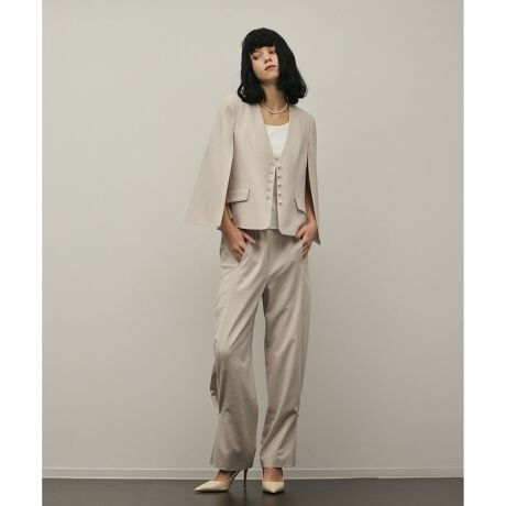 【Japan Fabric】 フォーマルスタイルをモードに格上げしてくれる、洗練されたセットアップを楽しめるケープジャケットが登場。ソフトウールタッチのトリアセポリエステル平織素材を使用。日本製ならではの上質でしなやかな生地を活かした、シンプルな表情の一枚です。フロントはあえてノーカラーのスマートなVネックにし、どんなインナーにも合うデザインに仕上げました。ケープスリーブのデザインが女性らしい華奢さや抜け感を演出し、シーズンらしい軽やかさをお楽しみいただけます。フロントには小さな5つのパールボタンをリズミカルに並べ、女性らしさと共にシャープなムードをプラスしました。カーディガンライクに気軽に羽織れつつも、大人っぽくモードに昇華した大人の女性のためのジャケット。お揃いでお作りしたパンツを合わせた、新鮮なセットアップスタイルもおすすめです。