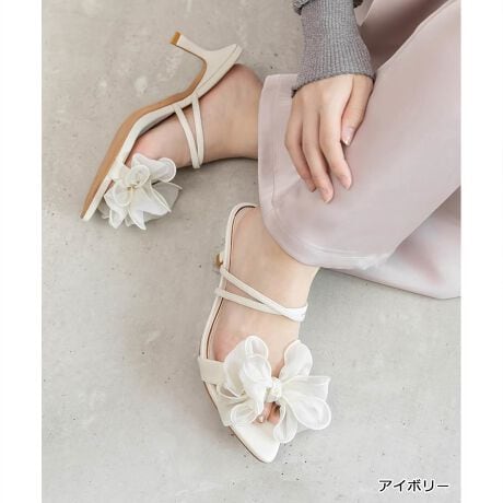 立体的なふんわりとしたシフォンリボンが印象的なミュールサンダル。
