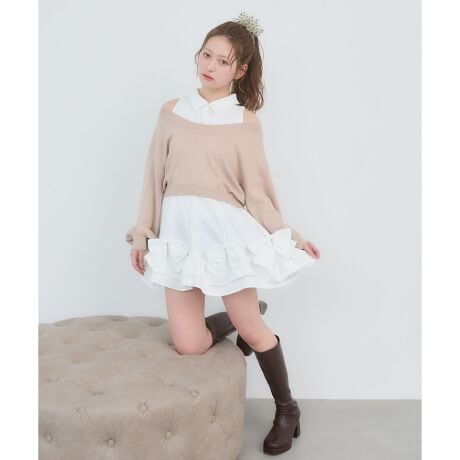ニットをレイヤードすることで、ニットの隙間から覗く肩のラインと華奢なリボンが、女性らしさと抜け感をプラスします。