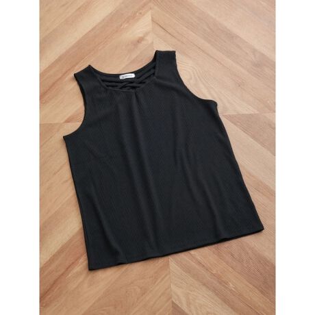フロントのクロスストラップデザインがコーデのポイントになるタンクトップ。