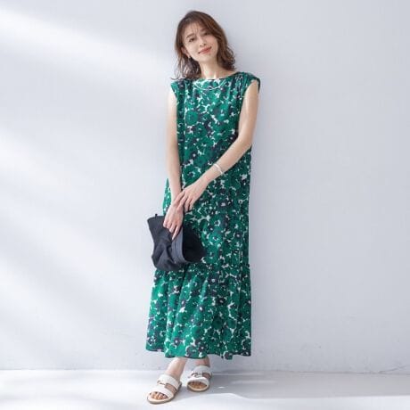 ノースリーブ仕様とマキシ丈の組み合わせが、涼しさとエレガントさを両立しています。