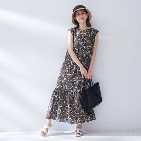 ノースリーブ仕様とマキシ丈の組み合わせが、涼しさとエレガントさを両立しています。