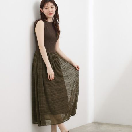 身頃にリブニット、スカート部分にチェック柄のシャーリングチュールをドッキングしたノースリーブワンピースです。