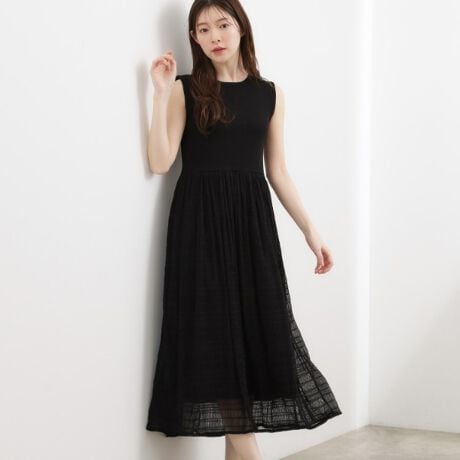 身頃にリブニット、スカート部分にチェック柄のシャーリングチュールをドッキングしたノースリーブワンピースです。