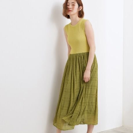 身頃にリブニット、スカート部分にチェック柄のシャーリングチュールをドッキングしたノースリーブワンピースです。