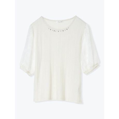 シアーな花柄とビジューが華やかさをプラスするトップス