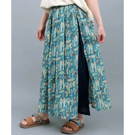 エジプトモチーフの柄が目を惹く、ふんわり涼しげなパンツスカート。