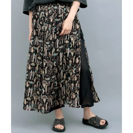 エジプトモチーフの柄が目を惹く、ふんわり涼しげなパンツスカート。