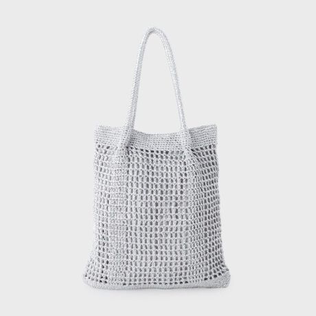 メタリック糸のメッシュで仕立てたマチなしのフラットトートです。