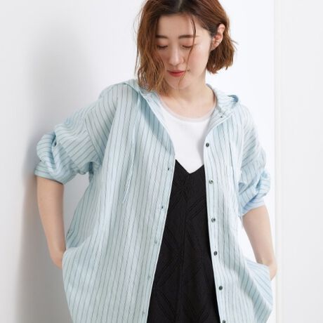 シャツのきちんと感とフーディのリラックス感を組み合わせたデザインで、デイリーに取り入れやすく仕上げています。