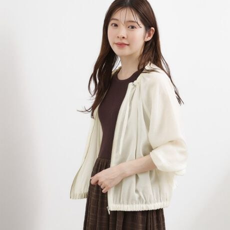 ネックにドローストリングギャザーを施したシアーブルゾンです。