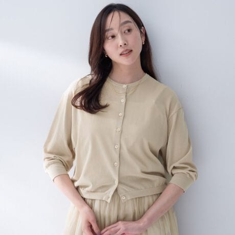 ベーシックな丸首デザインが魅力の七分袖カーディガン。
