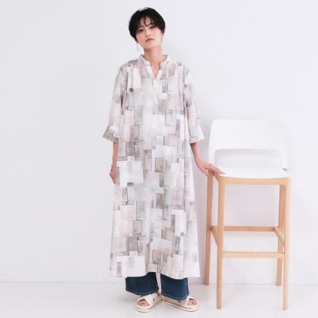 水彩画調の華やかなアート柄をプリントした、スキッパーデザインワンピース