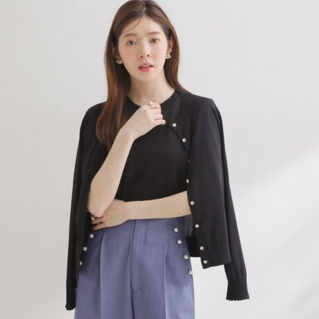ダブルパール調釦がアクセントのシアーニットカーデ