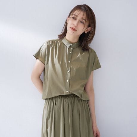 やわらかく清涼感のある素材でギャザーを入れ、ふんわりとした可愛らしいブラウス。