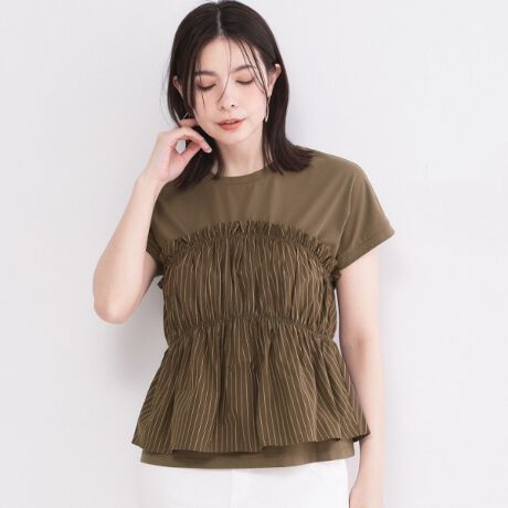 ・デイリーに着やすいTシャツに、ビスチェ部分はストライプ柄の素材を使用。