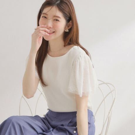 繊細な花柄のレースとチュールを重ねた袖デザインのテレコトップス
