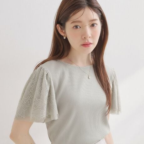 繊細な花柄のレースとチュールを重ねた袖デザインのテレコトップス