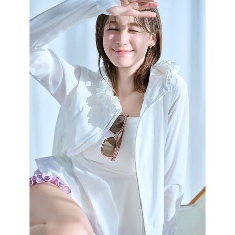紫外線対策におすすめのUVパーカー。頭をしっかり覆えるサイズのフードにフリルがついており、ポイントになりつつ小顔効果が期待できるようデザインしています。