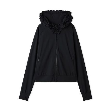 紫外線対策におすすめのUVパーカー。頭をしっかり覆えるサイズのフードにフリルがついており、ポイントになりつつ小顔効果が期待できるようデザインしています。
