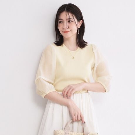 オーガンジー素材のシアースリーブが華やかなドッキングニットプルオーバー