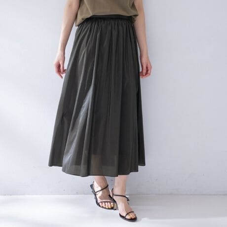 やわらかく清涼感のある素材で、ギャザーたっぷりのフレアースカート。