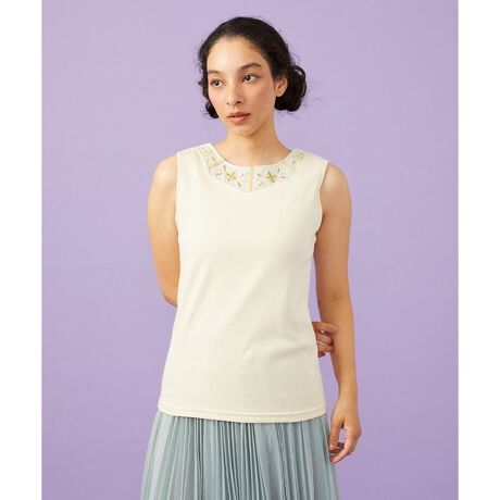 ホコモモラで毎年定番素材のタンクトップ。ほどよいフィット感のあるすっきりシルエットです。前後着用可能で、襟元のシフォン素材に刺繍を施した面と、配色テープを交差させた面のどちらを前にしてもお召しいただけます。胸元を華やかにしてくれるデザインです。コーディネートに取り入れやすく、様々なアイテムに合わせられるタンクトップは色違いで揃えたいアイテムです。