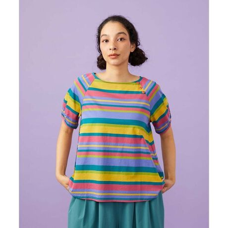 ホコモモラらしいボーダーが目を惹くカットソー。肩と袖にタックを入れ、ふんわりと柔らかなシルエットに仕上げたブラウスライクなデザインです。ラグランスリーブでリラクシーな着用感を実現。身頃上部と袖の切り替え部分には配色ボタンをアクセントをプラスしました◎日常使いにぴったりなアイテムです。