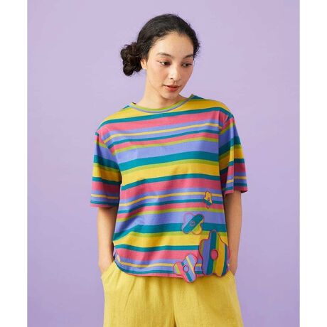 ホコモモラらしいボーダーが目を惹くカットソー。ゆったりシルエットでリラクシーな着用感を叶えます。裾には花の形のアップリケ刺繍を入れ、あえてはみ出したアップリケの立体感がデザインポイント◎華やかな印象で日常使いにぴったりなアイテムです。