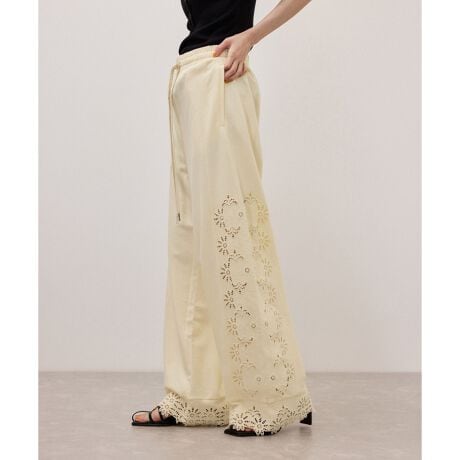 カジュアルなミニ裏毛素材のスウェットパンツの脇に、表地同色の繊細な刺繍を施しアップグレードさせたスウェットパンツ。?刺繍は太ももの中間辺りまでで施されているため、インナーを気にせず着用が可能。