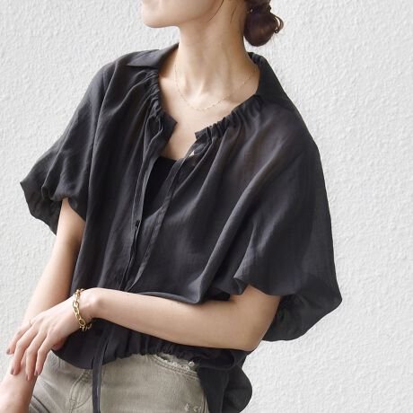 ネックと袖に施されたドロストとバルーン袖が目を引くデザインブラウスです。