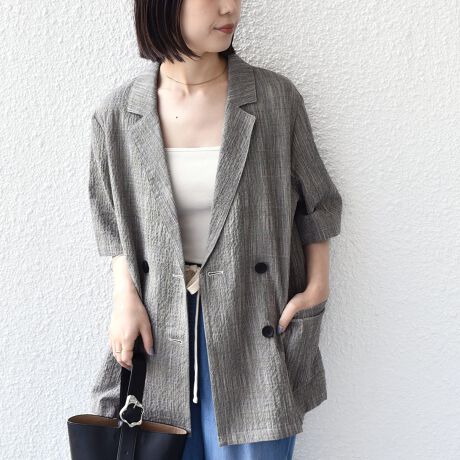 表面感のあるチェック柄生地が特徴の半袖ジャケット。