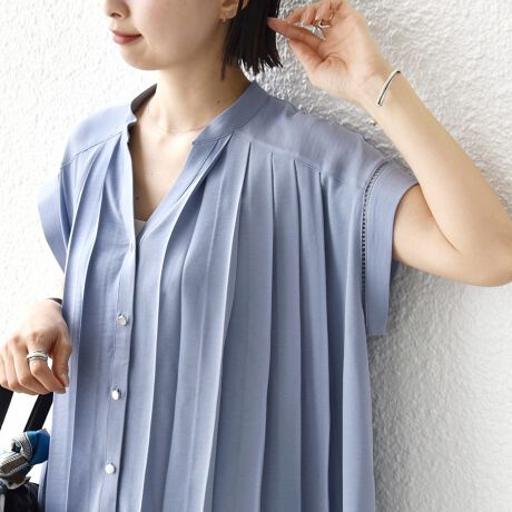 フロントにプリーツ加工を施しスキッパー襟のさわやかなデザインに仕上げました。