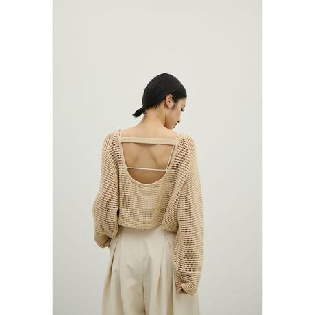 モデル身長163cm(FREEサイズ着用)異なる色のコットン糸とレーヨン糸を組み合わせて編み立てた、表情豊かなメッシュニット。後ろを大胆に開けたバックオープンデザインが、抜け感とモードな印象をプラス。身幅やアームホールをあえてゆったりと仕上げたルーズシルエットで、リラックス感のあるバランスに仕上げました。ざっくりとした編地が軽やかな印象を与え、タンクトップやキャミソールなどのインナーとレイヤードはもちろん、ワンピースの上から重ねるスタイリングもおすすめです。ストレッチあり、透け感あり。【お手入れ方法】手洗い可