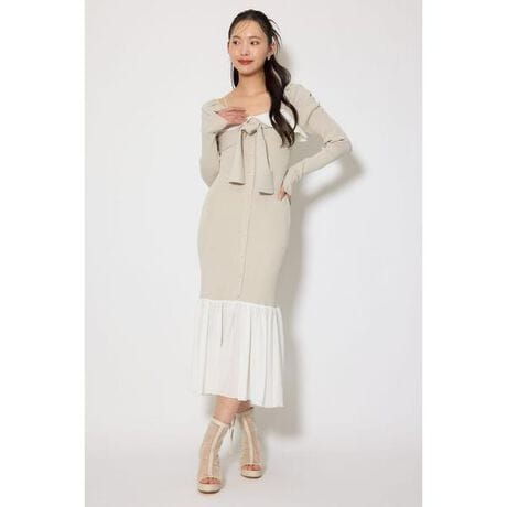 【レイヤードデザインとフロントタイ結びで華やかに決まるニットワンピース】■ポイントレイヤードスタイルが1着で叶うニットワンピース。裾は胸元にあしらった布帛と同じ生地を使用して華やかな女性らしいマーメイドデザインに落とし込みました。■ディテール襟元のデザインはまるでレイヤードされているかのようなデザインにしフロントはタイ結びに。すべてを固定されているので、崩れにくく着用するだけで様になるニットワンピースです。■スタイリングまだ寒い時期の足元はショートブーツで合わせて、温かくなってきたらミュールやサンダルで合わせるのもお勧めです。袖回りはスッキリデザインにしているので、どんな羽織でもバランス良くスタイリング可能です。■生地透け感:なし裏 地:なし伸縮性:ニット/あり、布帛/なし光沢感:なし厚 さ:ニット/中肉□薄手、布帛/薄手■商品のお気に入り登録お気に入りアイテムの再入荷・在庫1点などの通知を受け取ることができます。[注意事項]※画像の商品はサンプルです。実際の商品と仕様、加工が若干異なる場合があります。※画像の商品は光の照射や角度、お使いのモニター環境により、実物と色味が異なる場合がございます。※着用、お取り扱いの際は、アテンションタグをご確認ください。